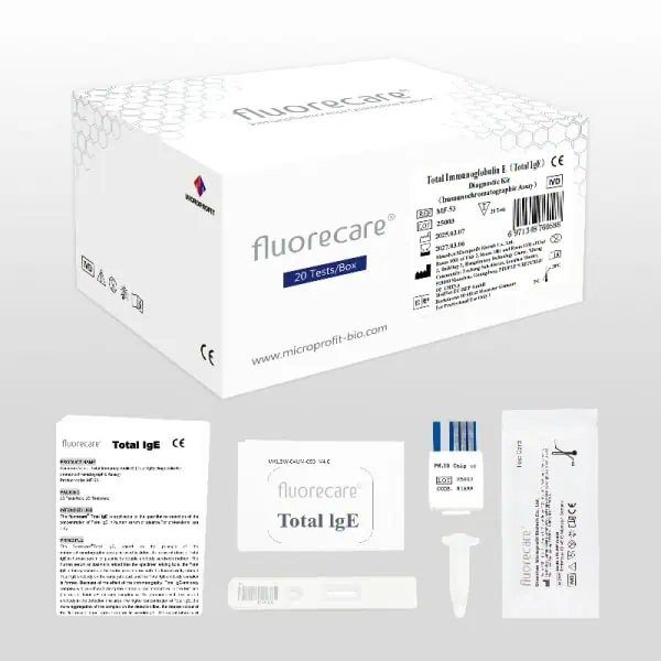 Los reactivos de laboratorio IgE en nuestra marca Fluorecare utilizan la tecnología de Inmunofluorescencia Seca Cuantitativa de Alta Precisión (Ultra Sensible) y tiene las siguientes características: